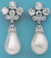 I've written an earlier blog post about the large pearl that King Charles I wore in one ear. It seems only fair to write about an equally famous pair of pearl earrings worn by his queen, and several others besides. Many legendary jewels of the past have disappeared through wars and revolution, or have been broken up, re-cut, and reset until they bear no resemblance to their original design. But these magnificent earrings, left, have miraculously survived with both pearls and diamonds intact, and with a tantalizing history to match.