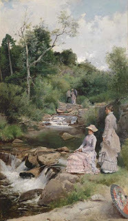Image: Enrique Estevan y Vicente, Zwei Anglerinnen mit Parasol am Bach (Two female anglers with parasol at the stream) 1880