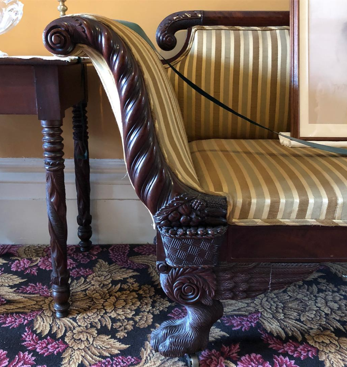 Bottom right: Sofa, c1810-1830, carved mahogany with upholstery. From bedroom furnished by the Daughters of the American Revolution.