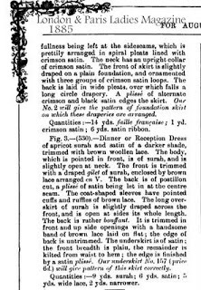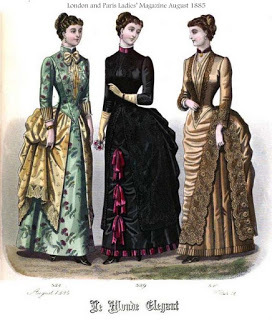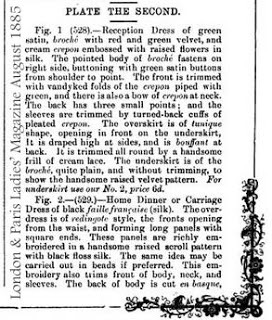 Fashion plates are from the August 1885 issue of The London and Paris Ladies' Magazine of Fashion, which included back views of the dresses, as you see.