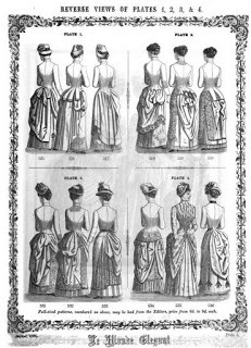 A reader’s comment on my 1885 fashion post , regarding the weight of this type of fashion, sent me in search of more than my vague guess at weight and (in)convenience. While 19th C ladies wore numerous undergarments, I’m focusing on the bustle, since emphasis on the booty is one of the most striking features of the year’s fashions.