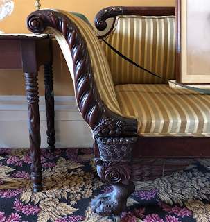 There are numerous sofas from this period on display in the Ten Broeck Mansion. I think I counted at least a half-dozen, each more imaginative than the last, and in beautiful condition. I'm featuring details of the carving from four of them here.