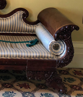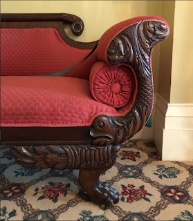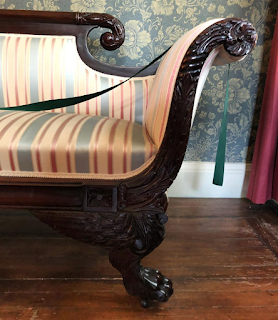 Last month I visited the Ten Broeck Mansion , an elegant Federal-style house built in Albany, NY. Built in 1797-98 by General Abraham Ten Broeck and his wife, Elizabeth Van Rensselaer, the house sits high on a hill, overlooking the Hudson River. The mansion is currently the home of the Albany County Historical Association, and most of the rooms are shown decorated to reflect the tastes of the early 19thc owners. I will be writing more about the Ten Broeck Mansion in a future blog post, but today I wanted to feature some of the most interesting - at least to me! - pieces of furniture on display: the sofas. (As always, please click on the images to enlarge them.)