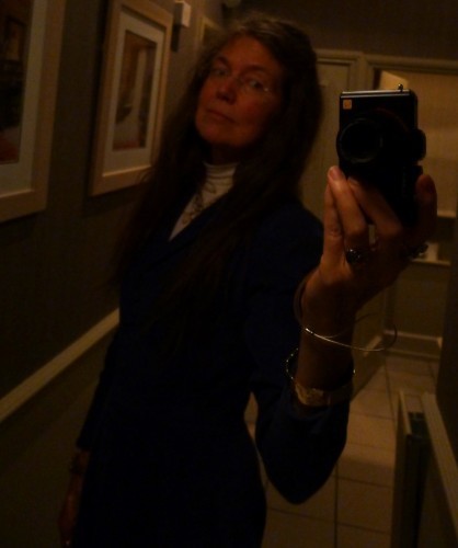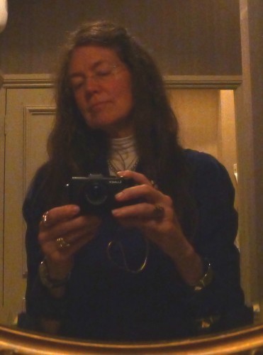 Although, speaking of going to the same restaurant, regular blog readers will probably recognise the mirror frame in the ladies’. [Oops. I've edited it out. Next year.] But they have installed an OBNOXIOUS NEW LIGHTING FIXTURE that is unromantic in the extreme and that my peculiar posture is trying to disguise.