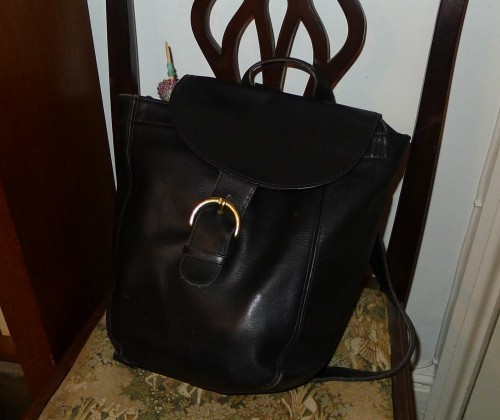Notice knitting needles sticking out of fancy leather going-out-to-dinner bag.†† Ahem. I’m so used to carrying vast swathes of my life around in my ordinary daily knapsack–which as a result weighs a TON AND THREE QUARTERS and people not eternally preoccupied with the terror of being caught somewhere without enough to read/do tend to make remarks–that when I have to wedge myself for a few hours into a Fancy Going Out to Dinner Bag there are AWFUL DECISIONS TO BE MADE. In fact I don’t usually take my knitting to restaurants because (a) the light isn’t good enough and (b) I’LL PROBABY SPILL SOMETHING ON IT but the iPad goes as standard and it happens that most of what I’m presently reading is on e- and therefore I had space ordinarily taken up by hard copy AND THE KNITTING WON. Furthermore I now have this deeply cool little (pink) narrow-beam light that Peter gave me for reading the prayer service in the frelling dark at the monks’, which would work just as well clipped to a napkin in a restaurant as to my collar in an abbey.