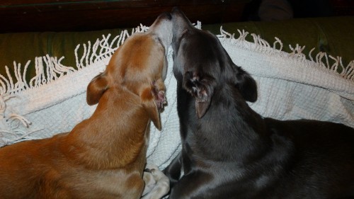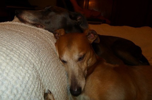 Hellhounds are EIGHT YEARS OLD TODAY. How time flies when YOU KEEP MOVING HOUSE.* Meanwhile I got home later tonight than planned and discovered us embroiled in Fresh Connectivity Issues** JOY. And furthermore my piano tuner is coming tomorrow not Tuesday–ahem, in the MORNING.*** So you’ll have to forgive me merely slamming a bunch of photos at you without my usual graceful and spirited commentary. And as you cast your gaze over all these sleeping-hellhounds photos remember what I said on Pav’s birthday about needing to remember to find the action-shot button on my camera before I need it. All or nearly all the sprinting hellhound photos you remember are from my old camera which was a lot less glam but also a lot less complicated.
