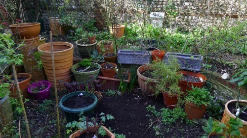 We have roses. We’re not supposed to have roses—it’s only the end of frelling April—and we don’t have many, but we do have roses. And they’re not even the so-called species* roses which are often the early ones, but proper overbred garden roses. Peter’s is even an Austin for pity’s sake, although she is on the front wall of the mews, and that courtyard is a heat sink, but I’m used to Austins in Hampshire starting up in June. My two, Sophie’s Perpetual and my beloved Old Blush, AKA (among other things) Parson’s Monthly, are certainly human bred roses, but they are also known for starting early and going on and on.** But THIS early?*** Never mind . . . I’m not complaining.