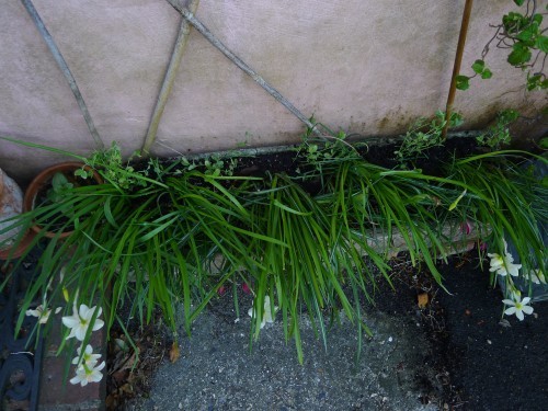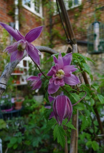 You can’t tell much from the photo but since it’s me you might hazard that the long bare stem in the big round pot is a rose. Yup. Mortimer Sackler and she’s almost as good as her hype. She might possibly do with more leaves however (I mean even after she gets going) and last year was adorable with sweet peas climbing up her. Barring accidents of a colour variety, as referred to above, I hope to repeat the effect this year. The clematis in the pot at the back is Fuji-musume and has the most amazing big flat blue flowers: the catalogue description is ‘Wedgewood blue’. I’ve never seen anything like it on a clematis.