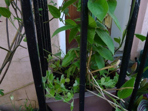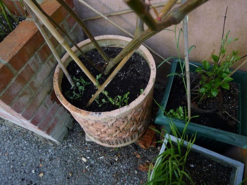More sweet peas. In three of the pot’s four corners, although you can’t see the far one. Some less desirous of embracing passing strangers fondly plant will go in the inside corner.