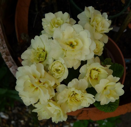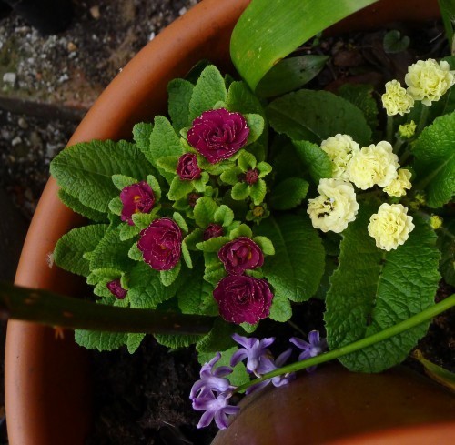 Primroses are so great. Even the fancy bred-up gardeners’ primroses, like all the doubles, don’t ask much. You put them in, they grow.