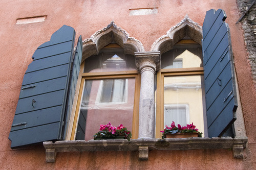More wonderful windows. Almost every window has a wide outside sill, with a brightly coloured pot plant on display.