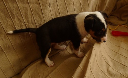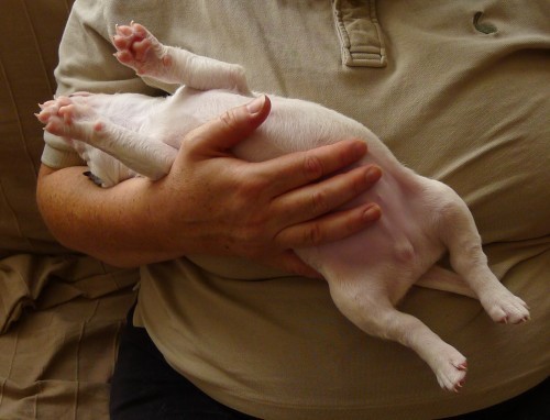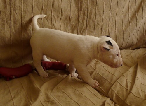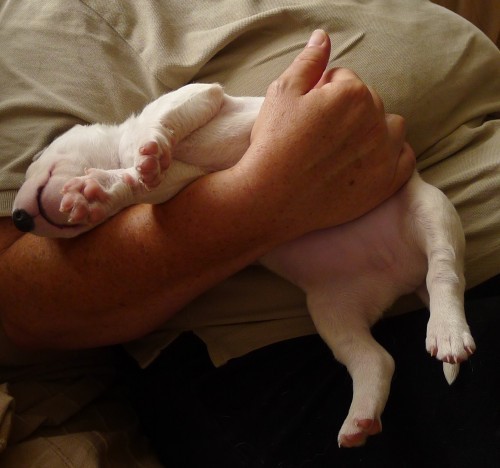 Yes. It’s too soon. It’s only been six years—in, in fact, October—since the hellhounds arrived and I remember it all too clearly. Noooooooooo. . . . And they were only hellhounds. This is a bull terrier puppy. Southdowner’s standard line about bull terriers is that they’re just like dogs, only more so.