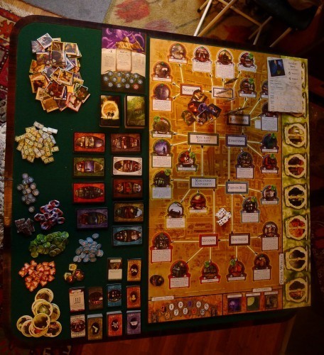 At least we managed to win this one. Arkham Horror, I am embarrassed to admit, belongs to me. Which is why I was the one doing all the frelling sorting. Well, it got all these fabulous write ups and recommendations and I have a weakness for Lovecraft . . . and Luke and his family are why I started playing frelling board games again for the first time in a quarter century or so when I moved over here. Aaron has a point about it being easier than making conversation. But as a result I’ve spent rather more time in board games shops and on board game web sites than I would have if left to my own innocent devices.** And I bought myself Arkham Horror, and gave them Mansions of Madness
