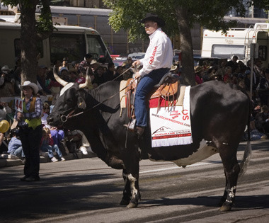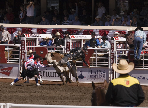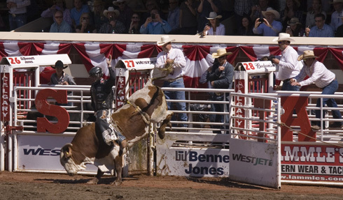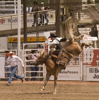 Bull riding is the climax of the rodeo. Again, the cowboy rides bareback, but without spurs, holding on with one hand to a braided rope looped around the bull’s girth. He has to stay on for eight seconds, and loses marks for touching the bull or himself with his free hand during the ride.