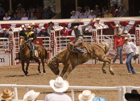 In the bareback and saddlebronc events, points out of 100 are awarded for the rider’s control during the ride and his spurring technique. If the rider touches the horse with his free hand, or fails to stay on the horse for eight seconds, he’s disqualified.