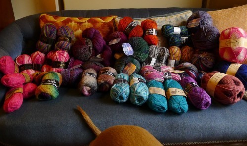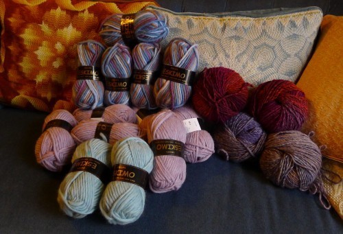 And none of it is sock weight. NONE. There are two pairs of leg warmers on the right. And the rest of it is a single jumper or cardigan-like object. There were only five of the striped yarn, of course. Life is like this. You can’t do anything useful with five little skeins of fat yarn. I perceive not merely stripes in my future but arithmetic. I’m already failing on the latter however. I meant to buy eleven skeins. I seem to have come home with thirteen. Fiona has suggested helpfully that perhaps they’re breeding.
