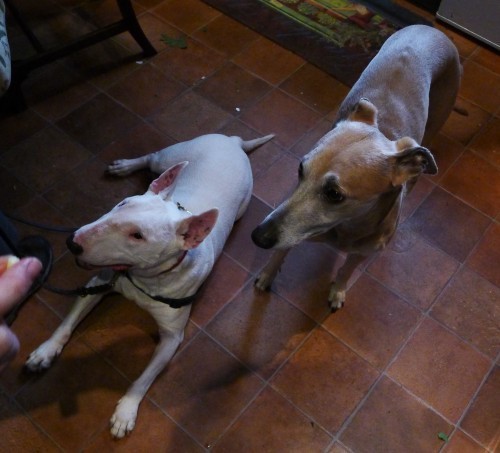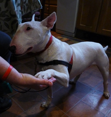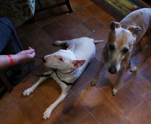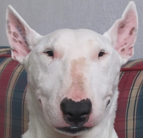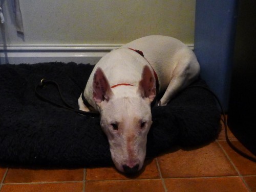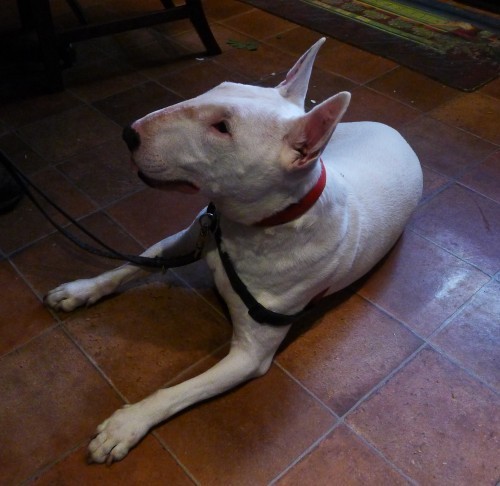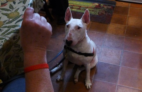 Well . . . Alex/Southdowner may want to put me right about this but (a) ALL dogs have the potential to be either sweethearts or dangerous and (b) bull terriers were originally bred to be fighting dogs and it’s unwise to forget this. Bullies were actually on my short list when I was between dogs this last time. They do tend to be people dogs, and I like the twinkle in their eyes, and I told myself that I could cope with one. Alex has 1,000,000# bullies and they all get along fine, so it can be done, but Alex is also a professional dog behaviourist and, as she says herself, socialises the bzrgm out of her critters.