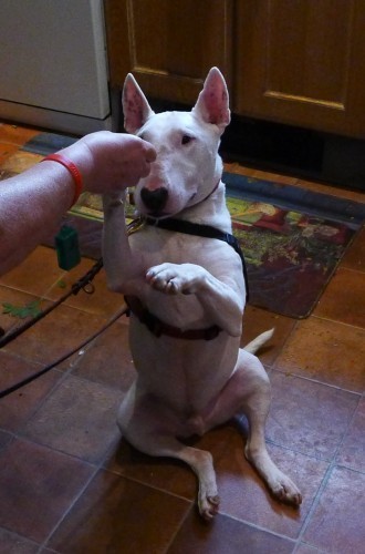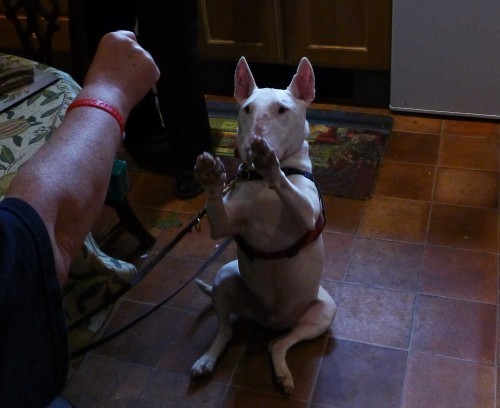 Alex says she didn’t teach him to sit up. He figured out this was a way to get cheese by seeing one of her other bullies ask for desirable ingestibles like this. IT MUST BE REALLY TERRIFIC HAVING FOOD ORIENTED DOGS, SO YOU HAVE A HOPE.