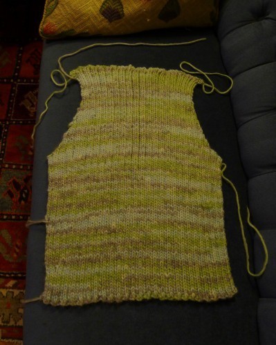 . . . is very straightforward—it’s exactly like half a back, with an armhole to shape just slightly differently than I did the first time, not, you know, because I mean to shape it slightly differently . . . sigh . . . I didn’t mind the casting-off and knitting-two-stitches-together decreases but I did not like it when I was shifted into every-other-row decreases, because my nice (relatively) smooth curve promptly developed an unsightly zigzag. As you can see in the photo. Feh. So, that will become invisible when I sew the sleeves in . . . theoretically. It’s a good thing wool is stretchy. I’m not convinced, given the semi-matchingness of my first attempt at a pair of shaped armholes, that the opposing pair of armholes plus the sleeves are going to anything LIKE fit together. I’m thinking maybe I’d better stay with the stretchy-wool option for any future projects for a while and leave the beautiful but unforgiving cotton Rowan Summer Tweed till I get my license to . . . frill?
