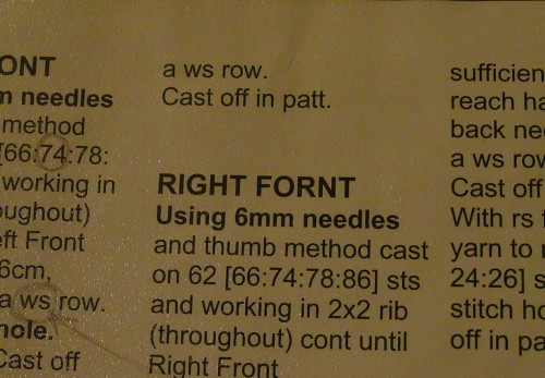 But the second front of First Cardi, you’re pottering along humming to yourself and suddenly it says: PATT 34 STS, TURN, LEAVE REM 22 ON A STITCH HOLDER. What? Turn? Rem? Stitch holder?**