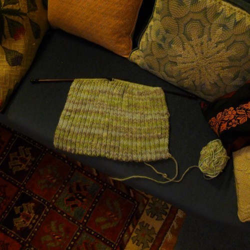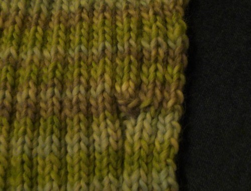 But I am so glad that I managed to half-plan and half-luck-into this particular pattern and this particular yarn for First Cardi. I knew from all those hellhound blanket squares that variegated yarn was the way to go: solid colours show up your mistakes way too much. And then I discovered the extra disguise feature of ribbing, so then I had to have ribbing too. The two errors we are examining here are only the largest and ugliest: there are lots of little gleeps and oopses. I want to be able to WEAR this sucker when I’m done—but I don’t want to spend the next six years ripping out and starting over either. And the yarn itself is just the right level of ‘I really like this, it’s pretty, and comfortable and satisfying to work’ but not to the dangerous ‘I am not WORTHY of this DIVINE STUFF and when I make a HORRIBLE MESS I will have to FALL ON MY KNITTING NEEDLES’ level. I have some of that yarn in my stash.