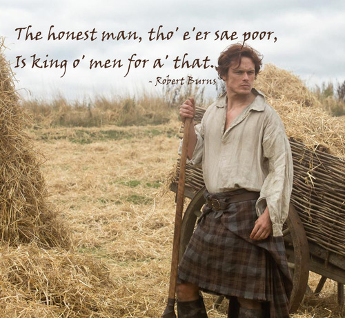 Luckily, we readers get to see those characters like Louis, Charles and Sandringham through the "independent minds" of Jamie and Claire. Being of independent mind they are able to show us the flaws in these characters. Claire especially reminds us that history books only provide two dimensions to these figures at best, It's up to the fiction writers to make these characters more than mere facts on a timeline, and I think the way that Gabaldon does this follows along the same sentiment as Burns's song. By that I mean that those who trumpet their own greatness or seek it out are less likely to actually BE great.