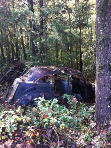 Just past the chair surrounded by high grass, is an abandoned car so close to the trees that it looks as if whoever parked it there had hoped that it would go unnoticed. The first time I drove by it, it reminded me so much of my granddad’s ’79 Nova that I had to stop and snap a picture. It was on a later trip that I came back with no children and got out to walk over to the car for a closer look. That was when I saw it. Downhill where the ground fell away from the shoulder surrounded by pine trees and high weeds was a car. I have no idea what kind of car it is I’m sure some car person reading this can probably identify it, but it’s one of the those beautiful art deco style cars from the late 1940′s with the smooth sweeping lines. The doors were gone and the trunk was askew, but beyond that it appeared to be intact. It wasn’t wrecked or on blocks or hidden under a tarp or lean-to. To my daydreamer’s eye, it almost looked as if someone as enchanted with the countryside as I am had just pulled off the road to enjoy a few quiet moments under the pines and left it there.