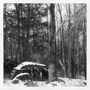 My mind immediately began creating scenarios to explain this beautiful car in the woods. First, it was just that someone had pulled into the trees to enjoy their beauty. Maybe they had gotten out and walked through the woods. That area is full of wetlands and black bears. Perhaps the car’s owner had wandered off and gotten mired in a swamp or attacked by a bear. On a more romantic note, maybe the car was pulled off the road to that spot for a lover’s tryst. It was just far enough off the road that it wouldn’t be visible to the average passing driver. Maybe they argued, and one left the other forever nursing a broken heart under the pines. Maybe another jealous lover had come upon them and done away with them removing their bodies, but leaving the car and whatever evidence it held to rot in the forest. My mind created pictures of people in post-war dress getting in and out of the car, leaning against the side, looking under the hood, dancing to Glenn Miller under the trees in the beams of the headlights.