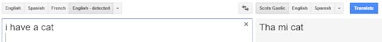 Most basic English sentences begin with the subject, usually a noun: I like cheese. Dave plays baseball…But in Gaelic, most sentences start with the verb that is often followed by the subject. If I want to say, “I have a cat” I would say Tha cat agam, which literally translates to “A cat is at me.” I tried this in Google Translate going from English to Gaelic and I got Tha mi cat, which is bad grammar but closer to “I am a cat.” than it is to “I have a cat.”