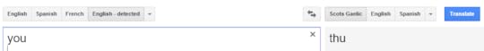 Like most romance languages (and old English) Gaelic has more than one version of you. There is thu which you would use when talking to a friend or someone your own age. Then there is sibh which is for addressing elders or people you aren’t acquainted with. It’s much like the difference between the Spanish tu and usted I tried translating you in several contexts from English to Gaelic and every time, it returned thu. Once again, clicking on the word gives you alternatives including sibh, but no information on when to use them and why.