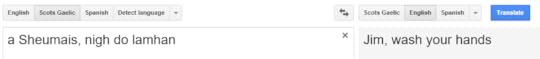 Directly Addressing SomeoneWhen you’re addressing someone directly in Gaelic, you put an a in front of their name and lenite the first letter and slenderize the last vowel for masculine names. Leniting and slenderizing are ways of modifying a word to show that it is linked with another word. In this case it’s creating a form of address that’s oddly like the way we address people on Twitter these days @Mary. In Gaelic it’s a Mhairi. First, there are only but so many proper names that actually translate to Gaelic, so Google Translate just can’t make some of them work. That’s not surprising, but it also doesn’t include the a that marks it as addressing someone. In the sentence below, it translates James into Seumas, but doesn’t make it a direct address. It should be a Sheumais.