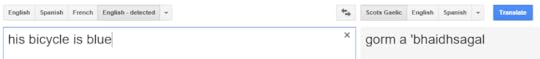 In Gaelic, adjectives come after the nouns that they modify. “The red car” is an car dearg. Google Tranlsate seems to get this right when you keep it simple. But when you add prepositional pronouns, the verb seems to disappear. I tried this with a few sentences, and it was pretty consistent. His bicycle is blue, turned into “blue his bicycle” there is no verb on the Gaelic side.