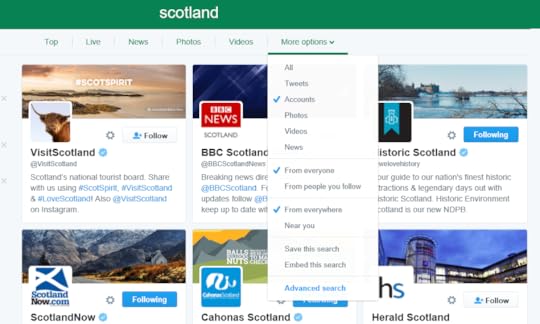 When you get your search results, change it to show the accounts related to these things by clicking on More options and choosing Accounts. Then follow those accounts that seem worth following. If you’re trying to connect with readers, you probably want to follow more people than media accounts, although some of those media accounts may have their uses too.