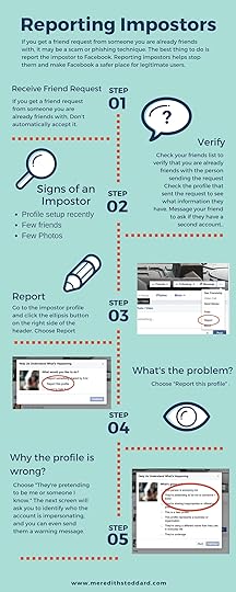Luckily for us, Facebook has a protocol for reporting exactly this kind of thing. It only takes a few clicks, but it can stop a scammer in their tracks. Of course, not everyone uses all the features on Facebook. Many people don't even know these things are there. So, I've made a handy infographic to walk you through the steps. (See all those years as an instructional designer are good for something ;)
