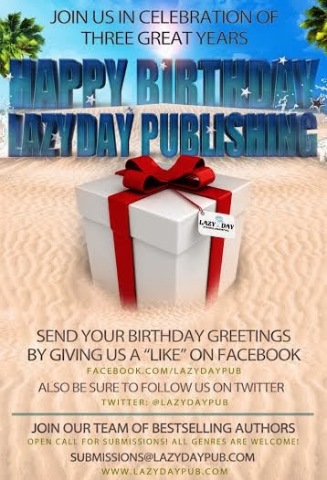 December 10th marks the three year anniversary of Lazy Day Publishing. Please join me in wishing them a very happy birthday and many more years of publishing success. If you aren't familiar with Lazy Day, please check out their website and their wonderful books. They publish many genres, including my favorite - spanking and DD books!