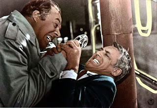 Part fool, part coward, is what he was, and here I am at one with him. Punch somebody? No no no. When it comes to a fight, as in Charade, he allows the George-Kennedy giant to defeat himself, then lectures him on loving thy neighbor—though that wasn't entirely his policy. Fuck you, I'm Cary Grant, is more like it.