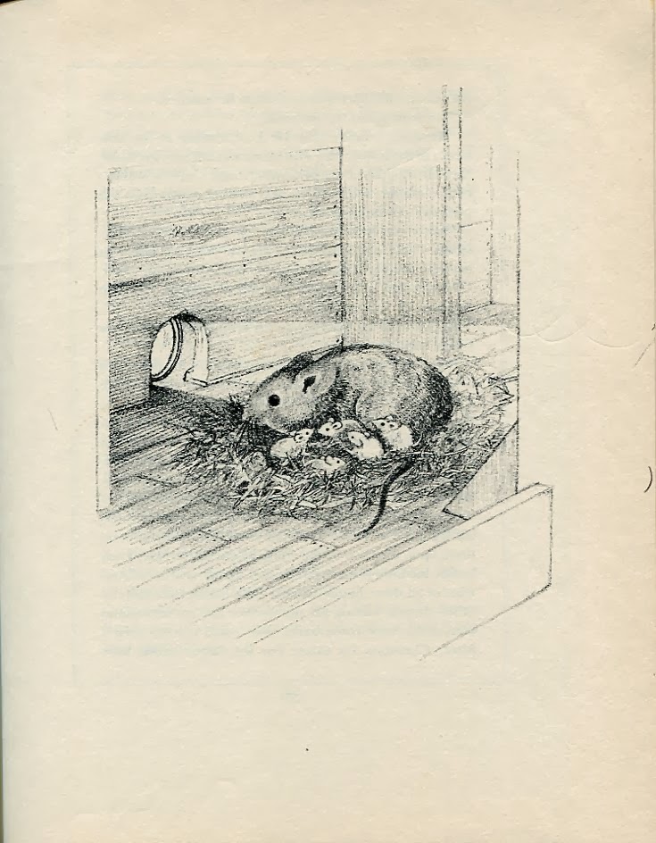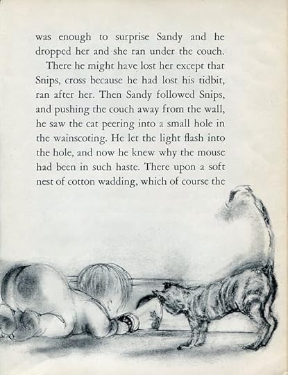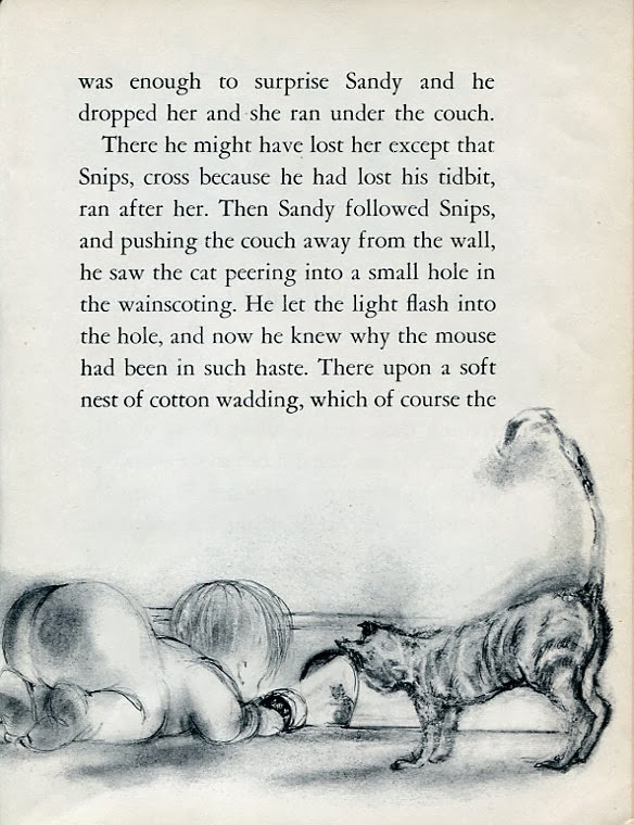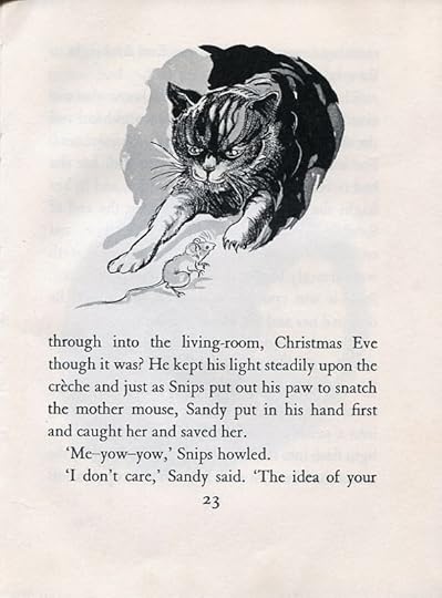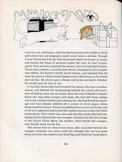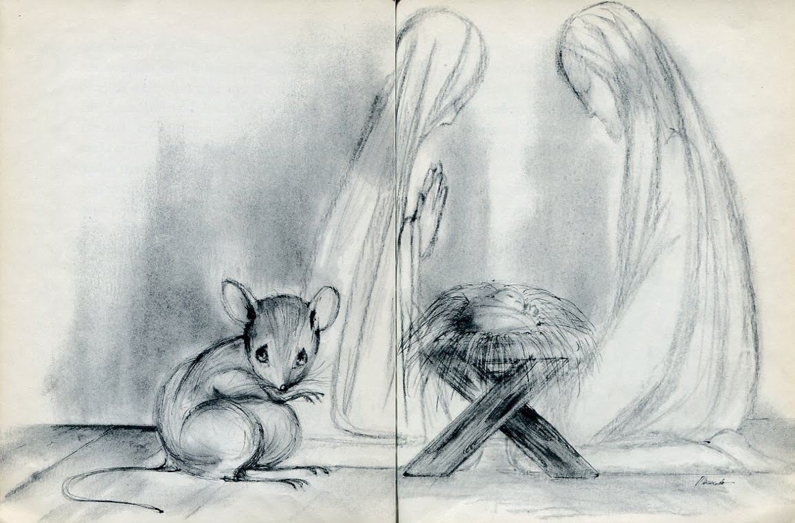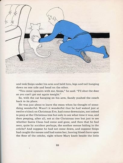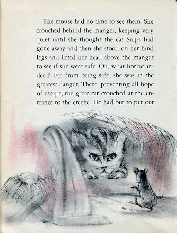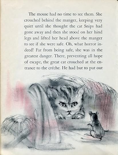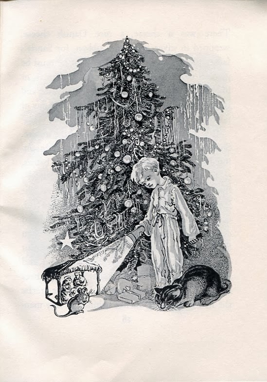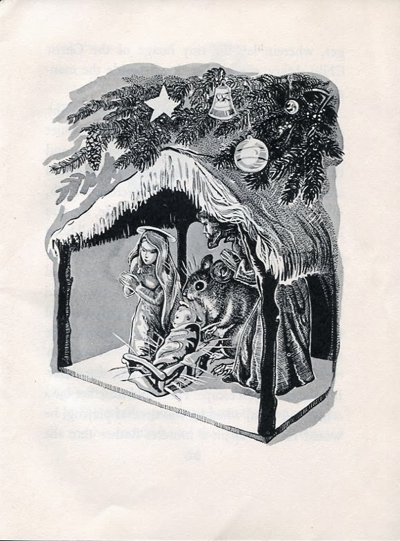 For Buck, a large part of that celebration was telling stories, many of which she recorded and published in magazines and as books. "I told my children many stories when they were small enough for bedtime stories, and each year they chose one to make into a book. The Christmas stories, of course, were always special." They included stories such as "A Certain Star," "The Christmas Ghost," "The Christmas Mouse," "Christmas Day in the Morning," and many others, which appeared in special Christmas issues of magazines like Good Housekeeping, Family Circle, Ladies' Home Journal, and Collier's before being reissued as books.In "Christmas Miniature," a 1956 special insert in Family Circle with art by the Walt Disney Studio, six-year-old Sandy makes the midnight trip downstairs "not indeed to peep at the Christmas tree but only to see what time it was." In so doing, he finds his cat Snips about to eat a mother mouse hiding behind the miniature manger under the tree. He grabs the mouse first, who bites him to escape his grasp, and dashes under the couch to return to her babies. The story was published as a book the next year with illustrations by Anna Marie Magagna, and included in Buck's Once Upon a Christmas with illustrations by Donald Lizzul (seen below).