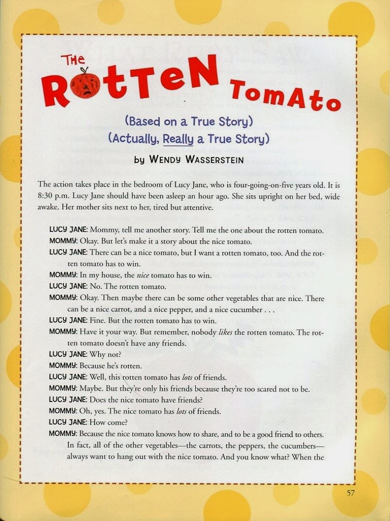 Wasserstein shares a bedtime conversation she had with her daughter Lucy Jane, who was four at the time. In "The Rotten Tomato," Lucy Jane asks for a bedtime story about a rotten tomato. Wasserstein wants to tell a story about a good tomato. Lucy Jane is willing to allow a good tomato to be in the story, but the rotten tomato has to win. They go back and forth with Wasserstein spelling out why being a "good" tomato is better than being a "rotten" one. As you would expect from Wasserstein, the scene is quite funny. (Click on the scans below to read.) Lucy Jane illustrated the story.