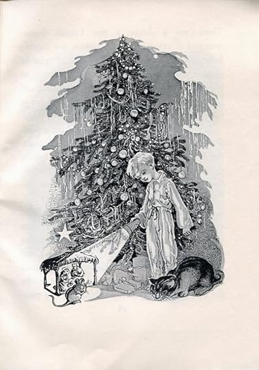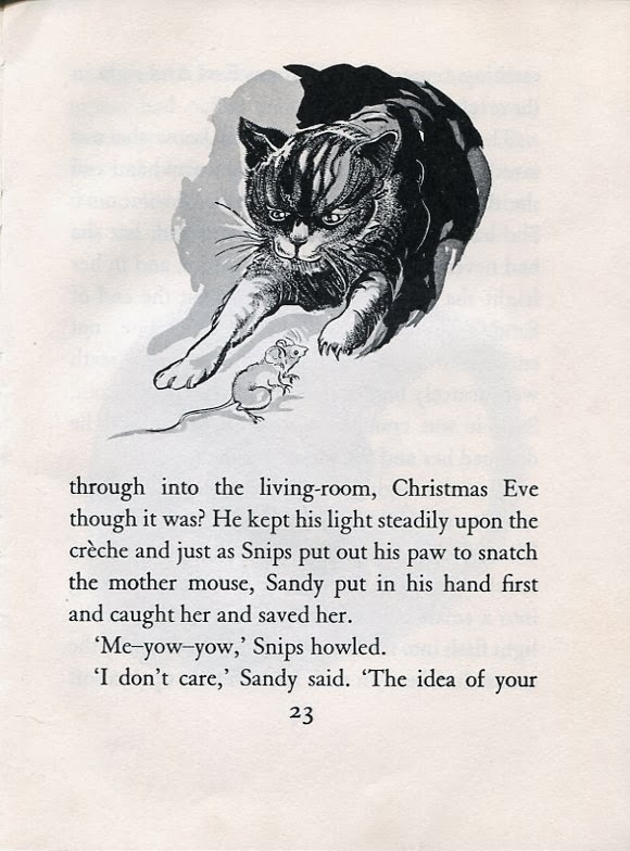 TALK ABOUT GETTING a lot of mileage out of one story. We have already looked at Christmas Miniature by Pearl S. Buck as it appeared in Family Circle Magazine and Once Upon a Christmas, and then as it appeared as a stand-alone book and in A Gift for Children. Well in Great Britain in 1958, Christmas Miniature was published again under the title The Christmas Mouse with new illustrations by Astrid Walford. From the back of the book: "The delicate and perceptive line and wash drawings by Astrid Walford are among the loveliest work she has ever done."There are a few minor differences between the U.S. and U.K. editions. For some reason the bicycle becomes a tricycle. The flashlight on the back of the book is translated as a torch, but within the book remains a flashlight. And the British spellings of words like pajamas have been predictably adopted.