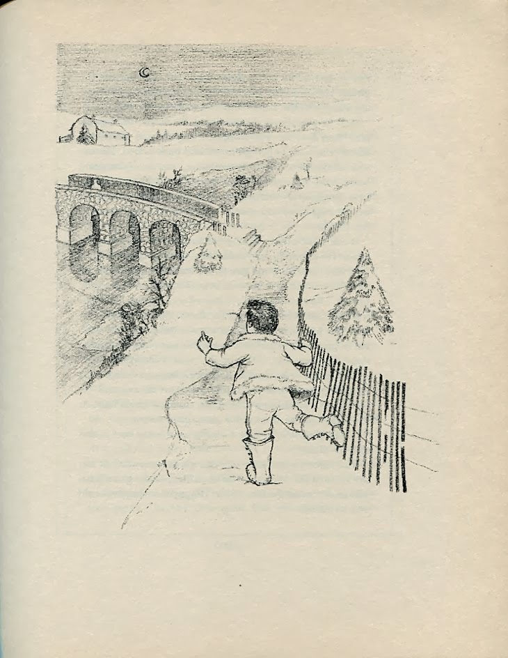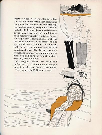 "The Christmas Ghost," which first appeared in a 1960 issue of Family Circle with illustrations by Gyo Fujikawa, tells the story of Jimpsey, a young boy whose family is celebrating their first Christmas in their new farm house after leaving the city. Mr. Higgins, the hired hand, tells Jimpsey that the ghost of the former owner Timothy Stillwagon walks from the barn to the bridge over the brook every Christmas Eve. When Jimpsey goes out in the middle of the night to see, he only finds Mr. Higgins there, who explains that it is the memory of Timothy Stillwagon that walks with him those nights, and that is what he meant by ghost.