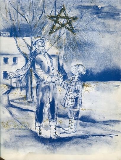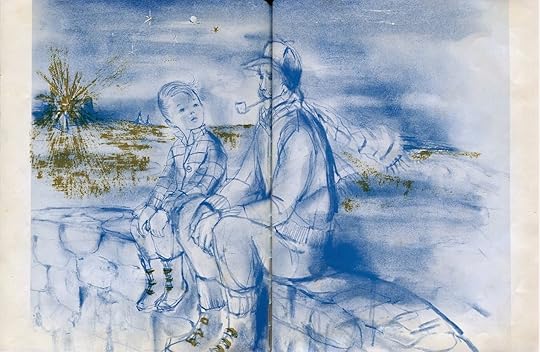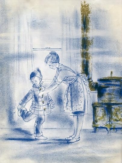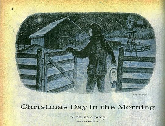 A story that Buck for some reason did not include in Once Upon a Christmas is "Christmas Day in the Morning," a story that first appeared in Collier's in 1955 (see art at top). "Christmas Day in the Morning" tells of how Rob, the eldest son of a farmer, realizes that the best gift he can give his father for Christmas is to wake up extra early and do the milking before his father has even gotten out of bed. This act grew out of the realization that his father truly loved him when he overheard his father saying to his mother how much he hates to wake Rob in the mornings. When his father finds the milking done, they hug in the darkness, unable to see each other's faces, but communicating their mutual love better than they have ever done before."Christmas Day in the Morning" was not strictly a children's story when it was published in Collier's, but it was made into a picture book posthumously in 2002 with some light editing, which removed the adult Rob's memories of his dead wife as well as his dead father. Illustrator Mark Buehner was inspired to illustrate the story after his own children woke up in the middle of the night one Christmas Eve to clean the entire downstairs floor of his house after hearing Buck's story at church, a testament to how touching Buck's work remains decades after her death.