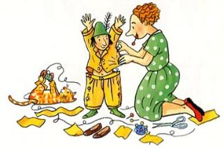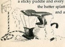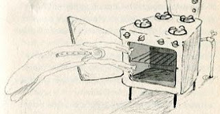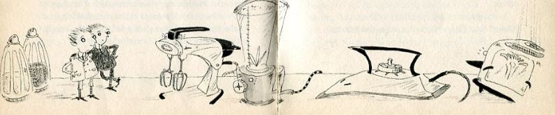 So they give their consent. Of course, they have to wait for Mrs. Cherry to leave the kitchen, which she does rarely. At last, a little before lunch time on the day set for the change-about, Sunny and Bunny, the twins from next door, come to tell Mrs. Cherry that their cat Fudge Ripple has had kittens. Mrs. Cherry goes to see them."And Whizz! Whirr! Bang! Clang!" The shirts go into the oven, unbaked plum tarts go into the icebox, the coffee percolator swallows ice cream, the iron tries making waffles. Unsurprisingly, they all fail miserably. What's worse, Mr. Cherry comes home for lunch unexpectedly, and sees all of the appliances going haywire. He runs out in a fright.