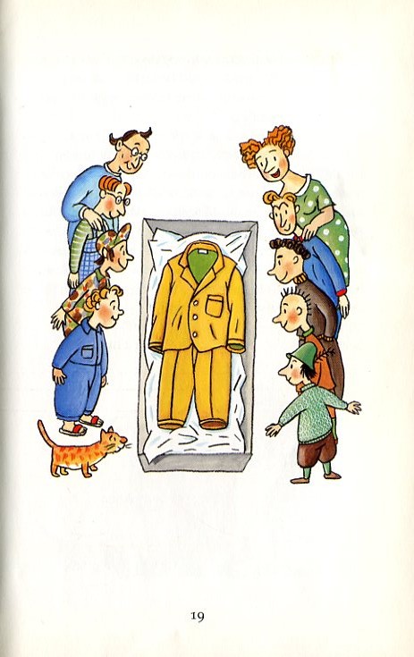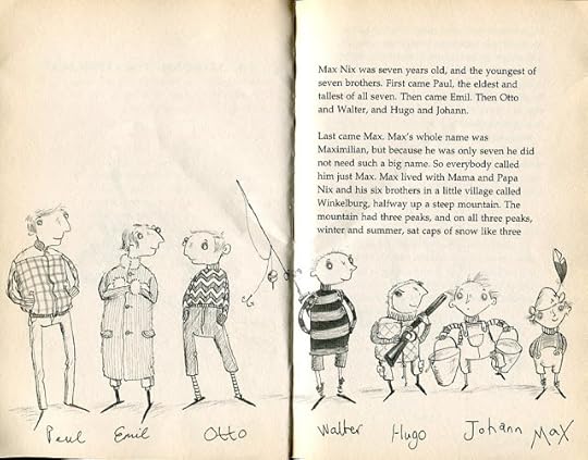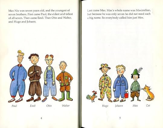 As the youngest of seven, however, Max is last in line for everything, and it doesn't look like his chances of acquiring a suit are all that good. Then one day, the postman delivers a box whose label has gotten wet, so that the only name legible was Nix. No one knows who the box is for, nor can they imagine what it contains. When at last it is opened, "there in the grey box with a wreath of white tissue paper around it lay a wooly whiskery brand-new mustard-yellow suit with three brass buttons."