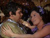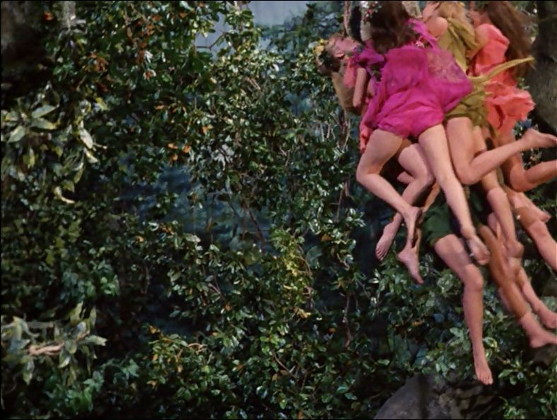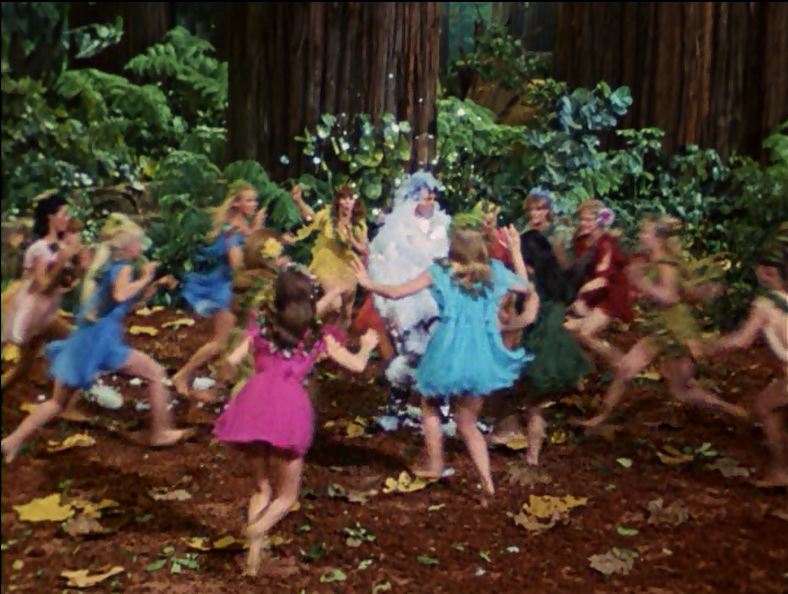 Rufus then yells, "Girls! Girls! Come on out girls! The eligible gnome is here!" and a bevy of girls in flowing dresses somewhere between a peasant dress and a mini-skirt comes flocking out of the underbrush. They line up. Jasper picks out the one he wants (Violet), only to be told "It's not the male that picks his mate, it's the she-male that picks the date."