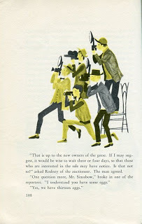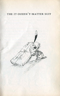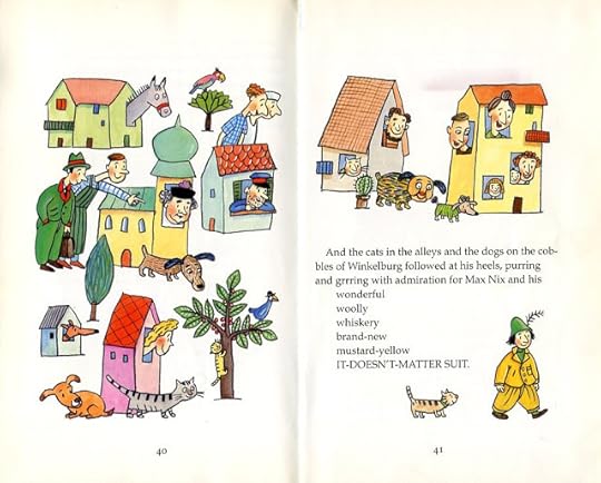 OUTSIDE OF THE UNBELIEVABLE PREMISE, that a seven year old boy would want a suit more than anything in the world, The It-Doesn't-Matter Suit is a delightful book. It contains many repetitious refrains, like "Such a suit had never been seen before in all Winkleburg, and "I am too big to wear a mustard-yellow suit," which I'm sure young children would enjoy.