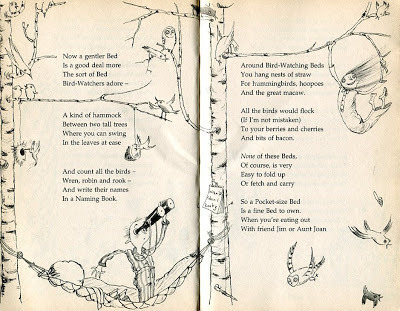 Plath said in her journal that she had chosen ten beds, but in the final book there seem to be a few more than that. Of course, she may have intended some of these beds to be the same bed. They are: a bed for fishing, a bed for cats, a bed for acrobats, a submarine bed, a jet-propelled bed, a snack bed, a spottable bed, a tank bed, a bird-watchers bed, a pocket-size bed, an elephant bed, and a North-Pole bed.Beds come in all sizes--