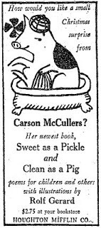 WHAT LITTLE INFORMATION I could find came predominantly from The Lonely Hunter: A Biography of Carson McCullers by Virginia Spencer Carr. I also consulted Carson McCullers: A Life by Josyane Savigneau. To see Sweet as a Pickle and Clean as a Pig in its entirety, go to my Flikr set here.