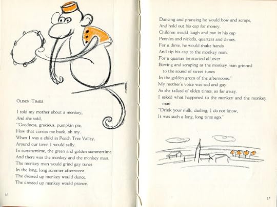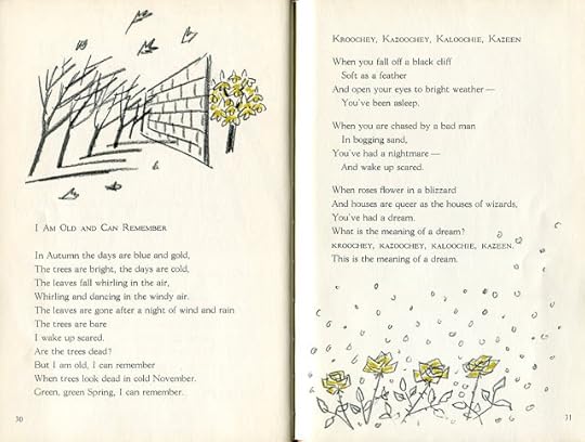 The book was not well received, and it's not hard to see why. The poems alternate between light nonsense verse in the vein of Mother Goose, and free verse observations and reminiscences tinged with melancholy.