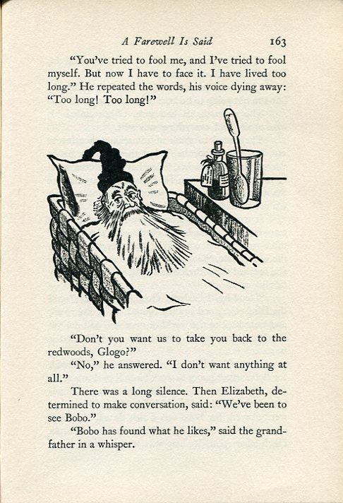 Elizabeth has neglected to mention that Rodney is the youngest son of a logging scion, who is vastly wealthy for cutting down a vast number of trees. But Rodney abhors his father's business, and has even bought forest land to put aside as state parks. When Elizabeth says she wants to return to the redwoods, Rodney is more than game. They drive back to the redwood forest where Elizabeth introduces him to Bobo, and Bobo introduces them both to Glogo.Glogo does not want to meet the big people who kill trees. "'A tree has no tongue with which to make words. A tree speaks in actions. If you love it and live with it, its spirit becomes one with yours and you understand it, and hate the madmen who murder it.'"