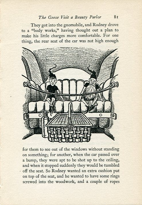 The quartet begin a long road trip all over the United States, stopping at forest after forest, looking for gnomes. Along the way, questions are asked about what lives in the two baskets Rodney and Elizabeth carry with them to hide the gnomes. At one hotel Rodney answers that they "are royal Abyssinian geese,' but won't show them. The mystery attracts the local newspaper, "Lumber Scion Carries Pet Geese," and soon it's national news. Rodney and Elizabeth are hounded all along the way by papers such as the Whizzle-Bang, Fizzle-Toot, and Sizzle-Hoot.They know it is essential, however, that the gnomes remain a secret, to protect them from being endangered or exploited, but the press won't leave Rodney and Elizabeth alone. Eventually, Rodney buys two real geese, and auctions them off with proceeds to go to the Green Cross, a conservation group. However, he makes the mistake of saying he has Abyssinian goose eggs, so the speculation and interest continues.